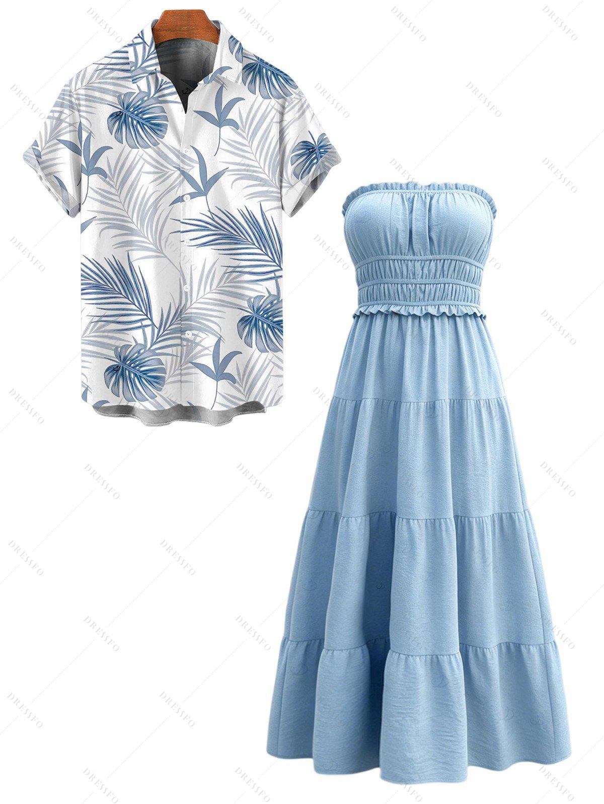 Hawaiian Vacation Couple Outfit Solid Color Ruffle Smocked Off the Shoulder Maxi Tired Dress and Tropical Leaf Print Shirt Set - Bleu clair S | US 4