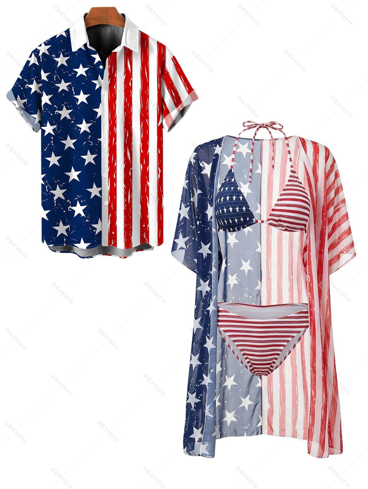 Independence Day Couple Outfit American Flag Star Striped Print Halter 3 pcs Swimsuit with Cover-up and Shirt Set - multicolor A S | US 4