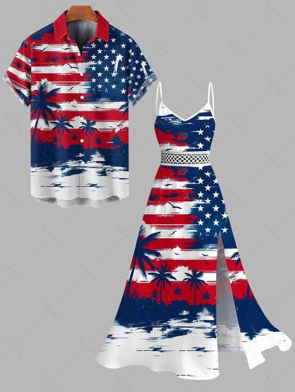 Independence Day Couple Outfit Star Striped Pattern Coconut Tree Hollow Out Slit Dress and Shirt Set - multicolor S | US 4