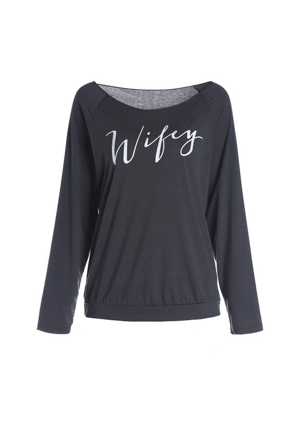 La mode Lettre Imprimé inclinaison du cou à manches longues T-shirt pour femme - gris foncé S