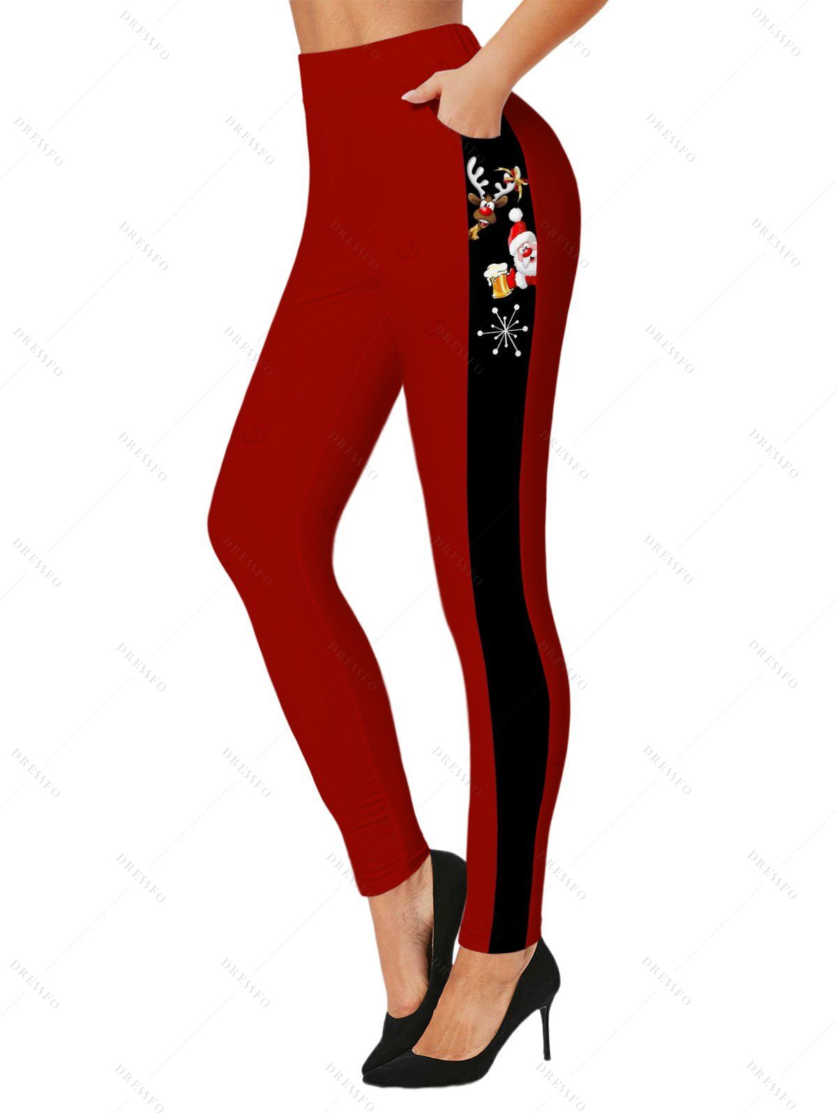 Leggings de Noël Leggings skinny à imprimé Père Noël, élan, flocon de neige et blocs de couleur - Rouge Vineux S | US 4