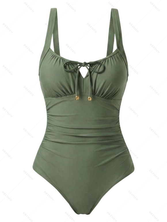 Maillot de bain une pièce de plage, couleur unie, décolleté en V, nœud papillon froncé - Vert Armée S | US 4
