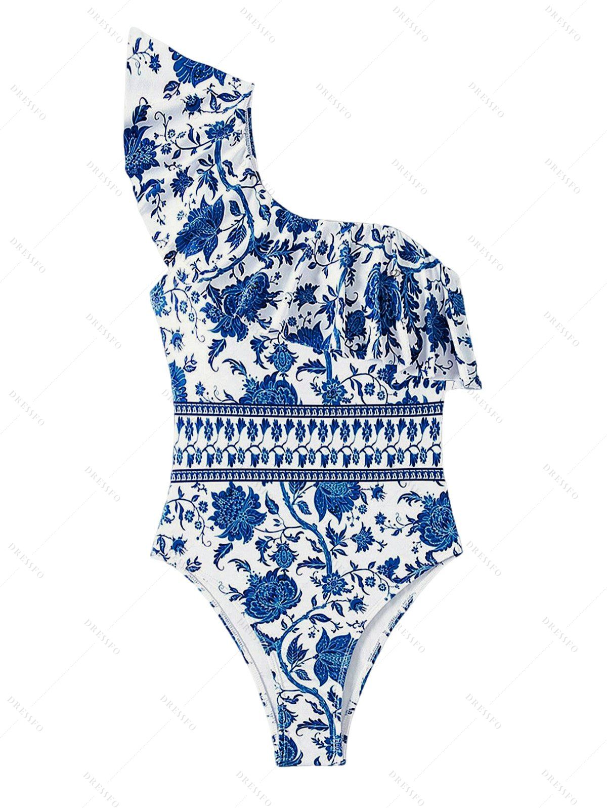 Maillot de bain une pièce de vacances bleu et blanc à imprimé floral porcelaine, à volants et une épaule