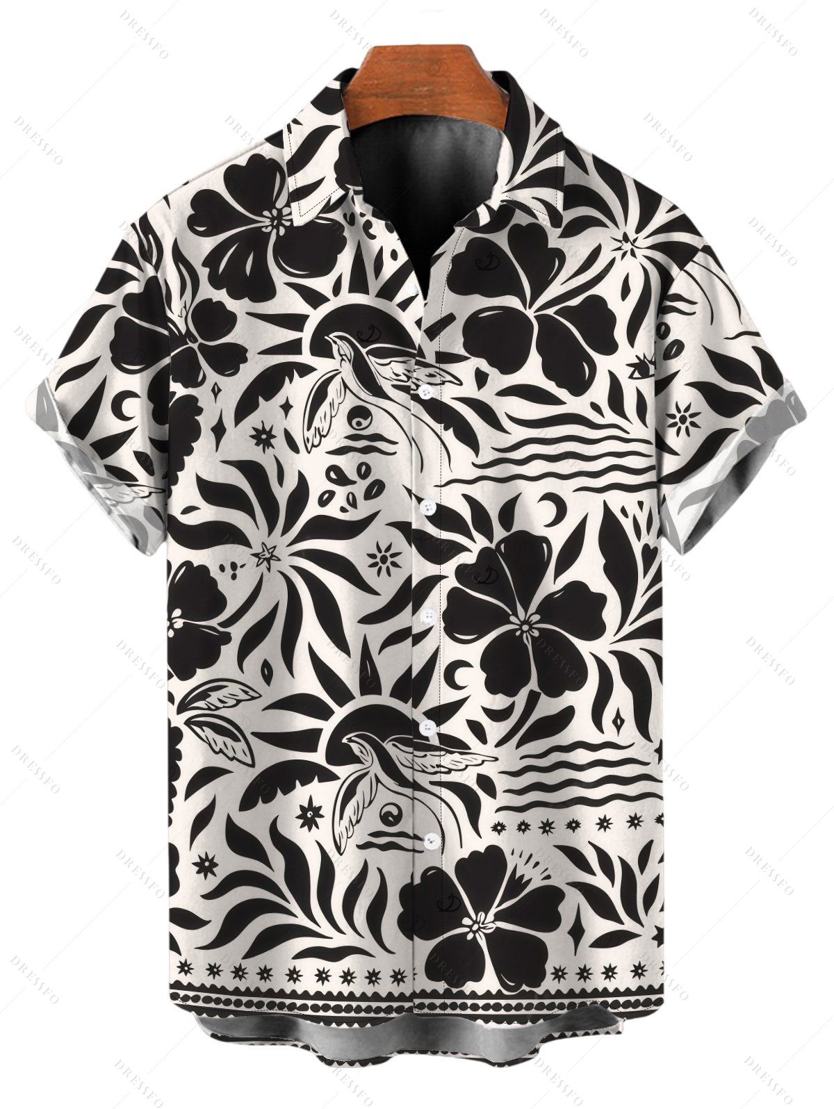 Men's Hawaiian Vacation Shirt Monochrome Vintage Floral Bird Print Button Up Shirt