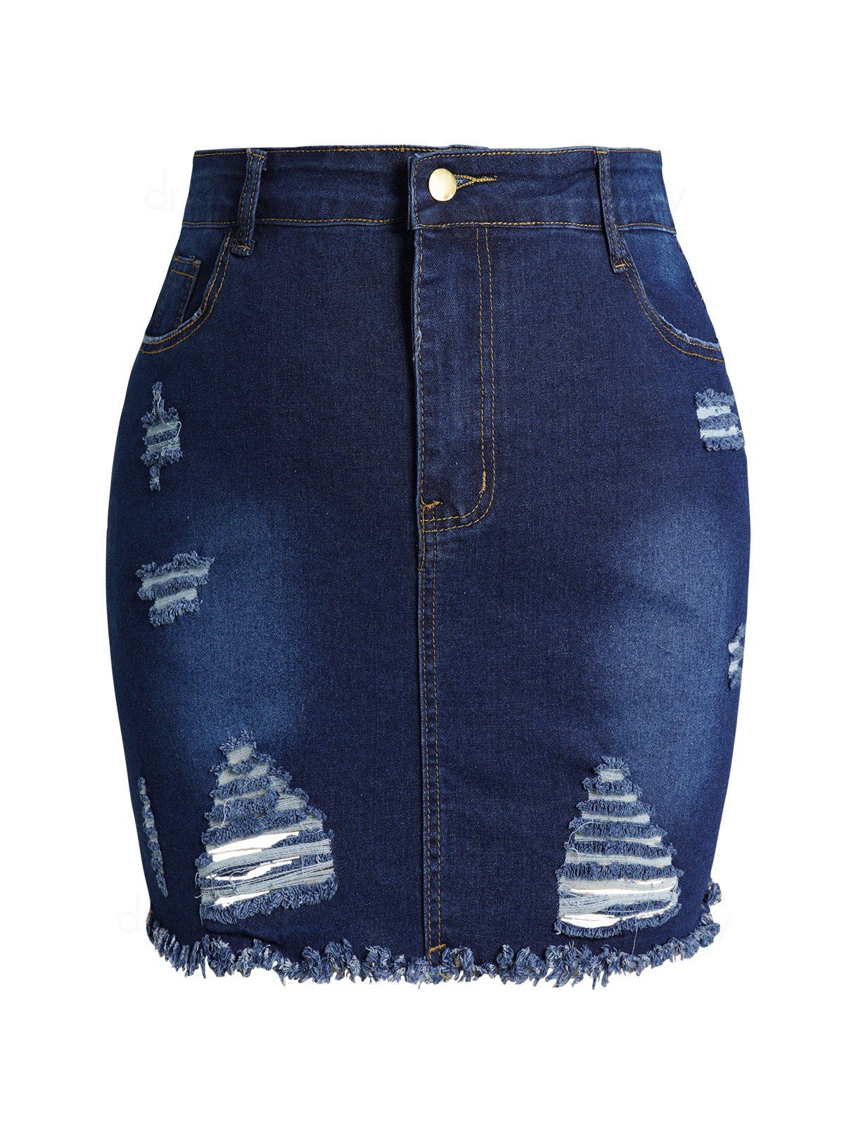 Mini Jupe Zippée Déchirée à Ourlet Effrangé en Denim avec Multi-Poches de Grande Taille - Bleu profond 2XL
