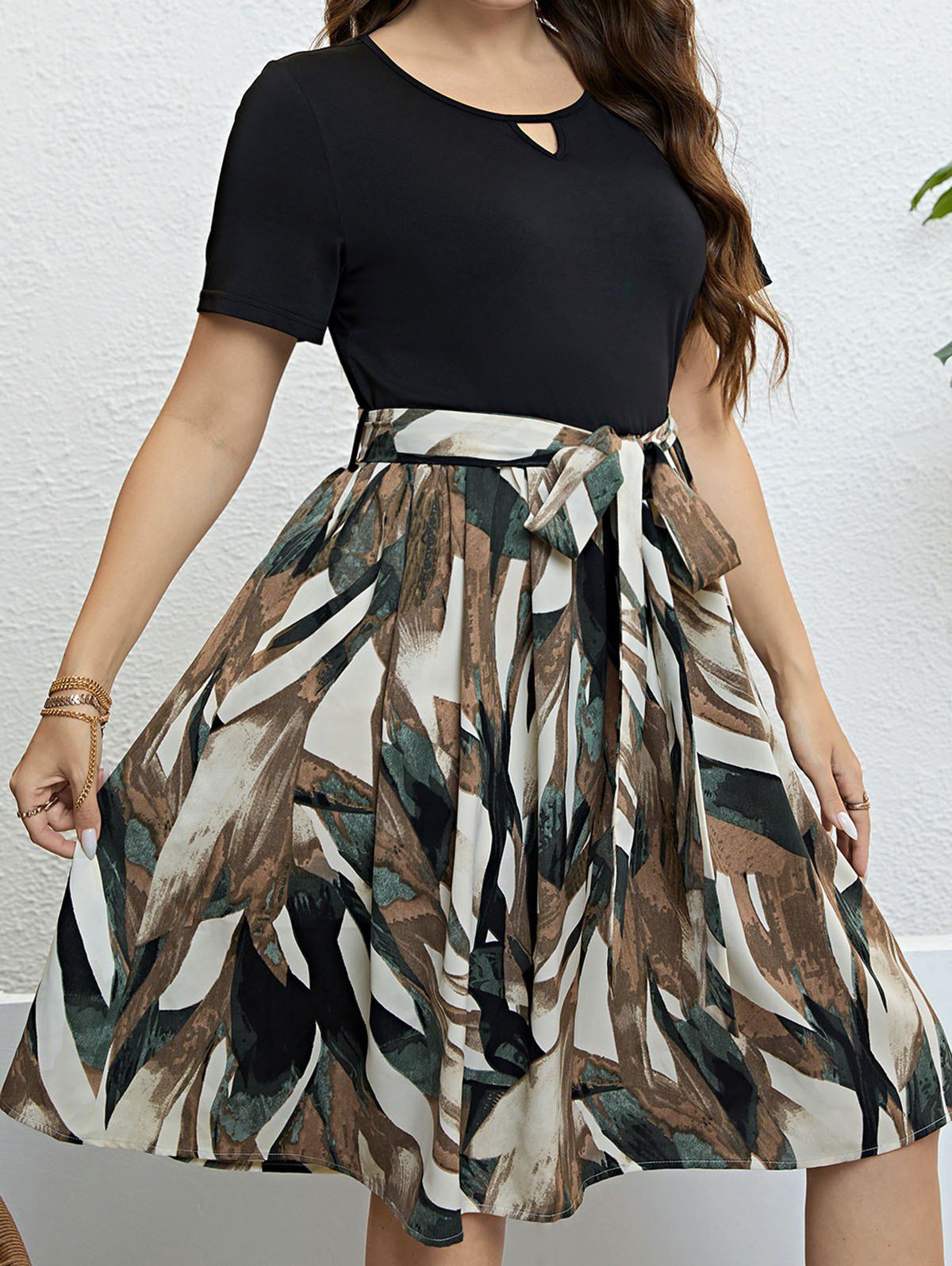 Mini Robe Ligne A Ceinturée Imprimée à Taille Haute avec Trou de Serrure de Grande Taille - Noir 3XL