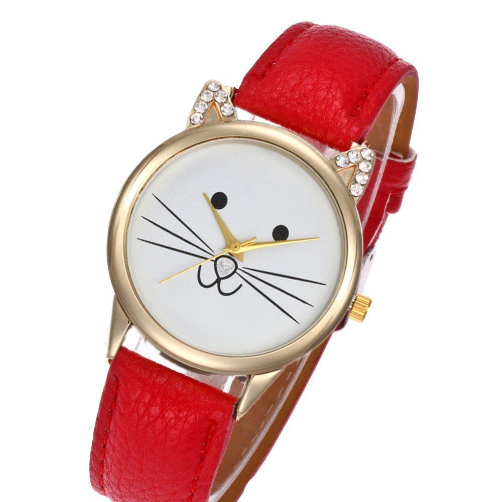 Montre de diamant artificielle de chat de bande dessinée - Rouge