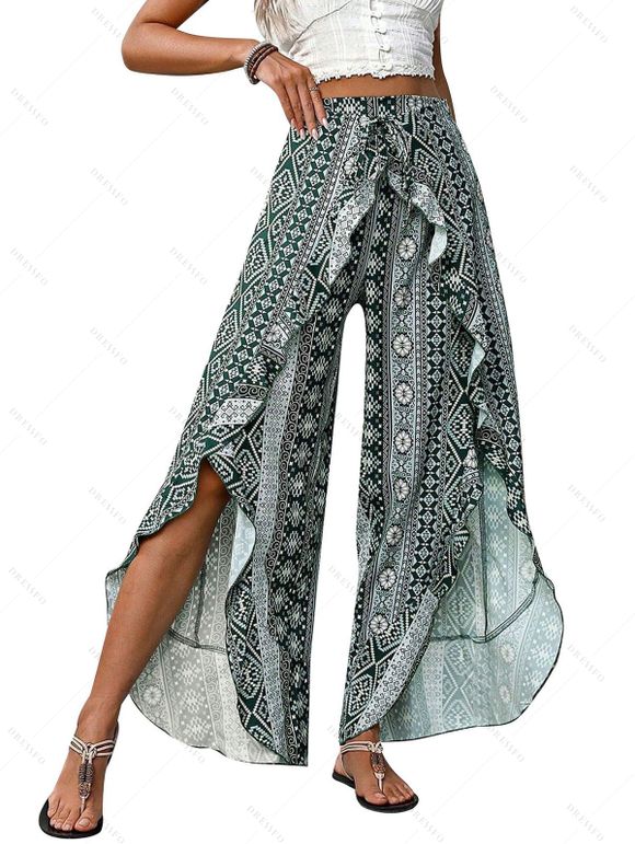 Pantalon de vacances à jambes larges, style ethnique, imprimé géométrique, fentes superposées - Vert profond XL | US 10