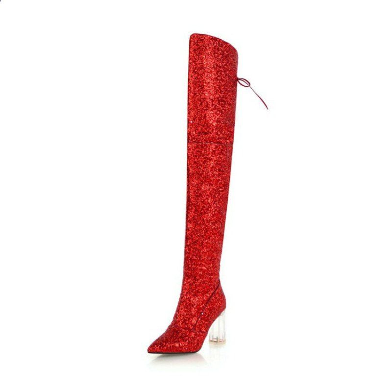 Pointu épais avec des talons hauts bottes au genou sexy européen et américain - Rouge EU 38