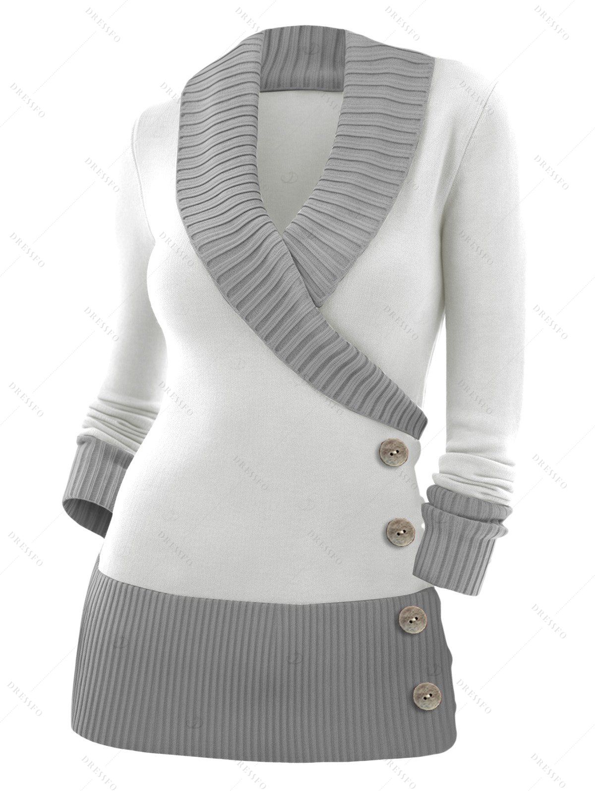Pull colorblock à faux boutons et col cache-cœur, manches longues - Blanc XXL | US 14