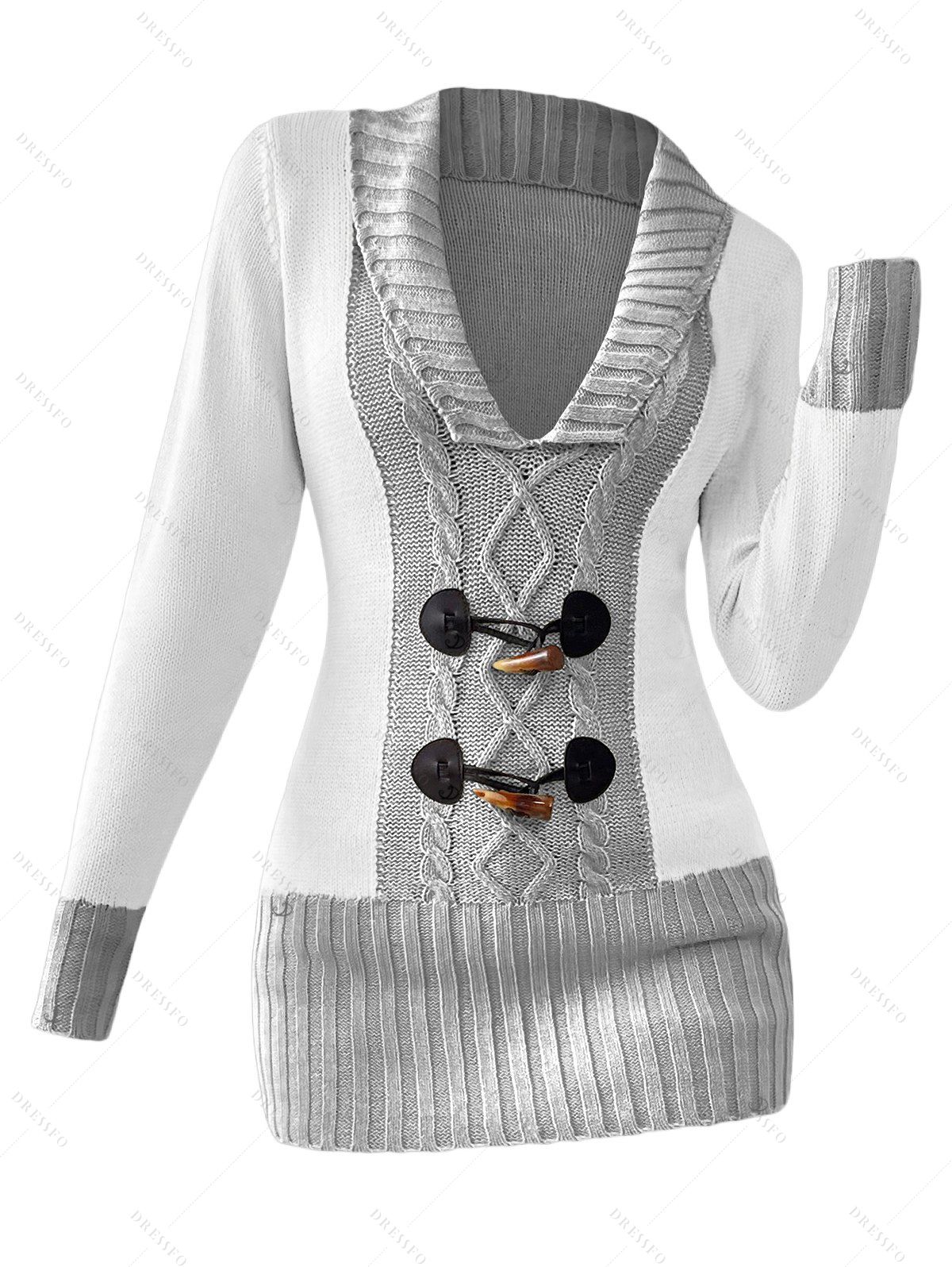 Pull décontracté à col plongeant et boutons en corne de couleur contrastée - Gris Clair L