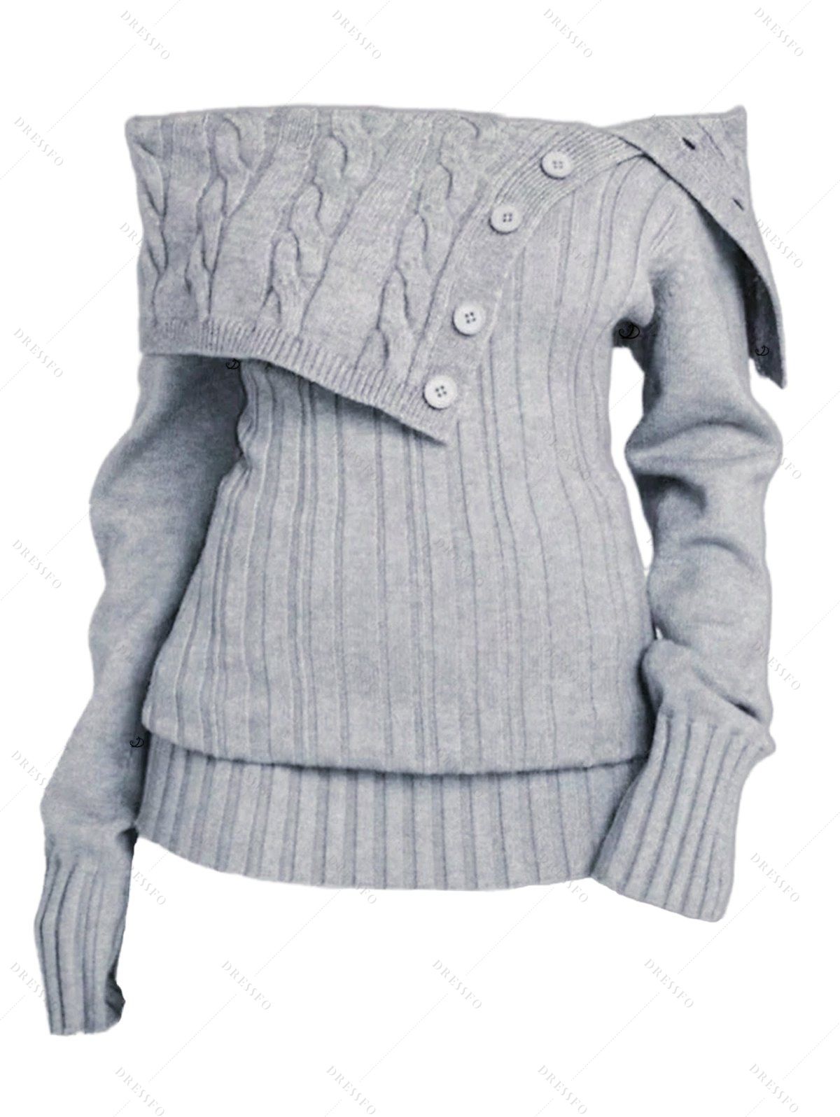 Pull à épaules dénudées, couleur unie, maille torsadée, faux boutons - Gris Clair S | US 4