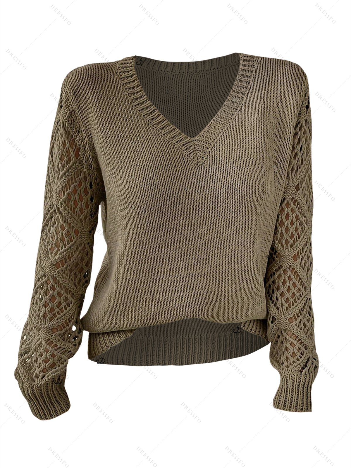 Pull tricoté de couleur unie à manches longues et col en V ajouré