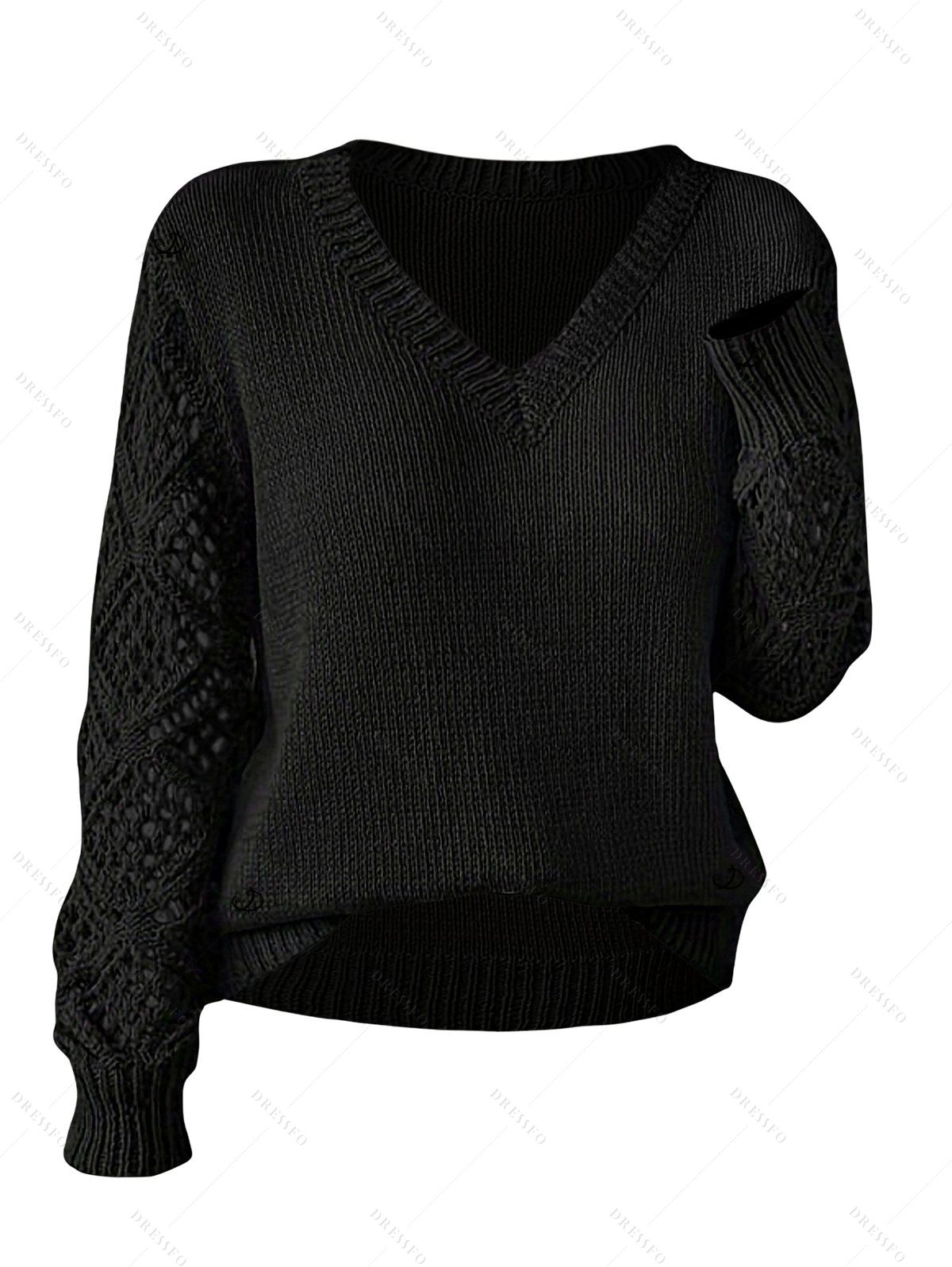 Pull tricoté de couleur unie à manches longues et col en V ajouré - Noir XL | US 10
