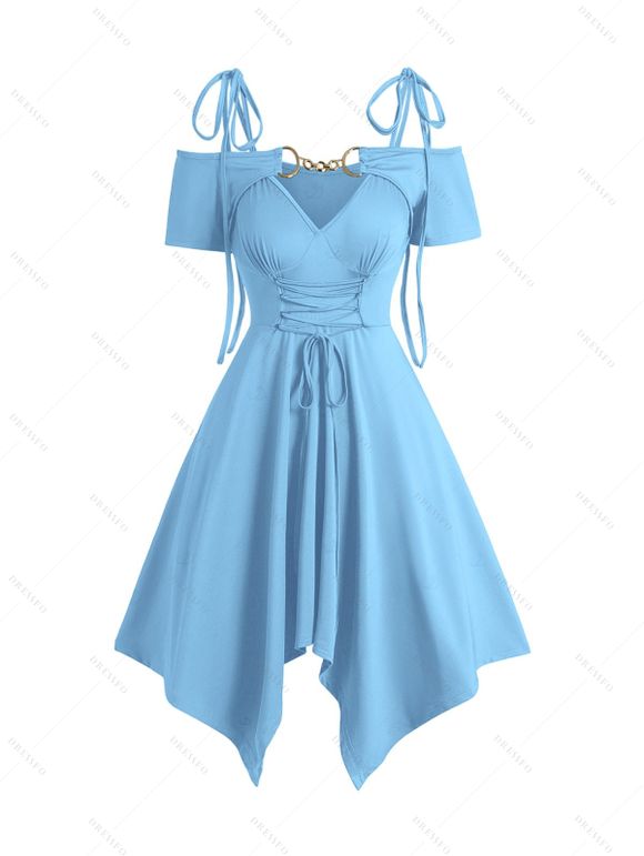Robe asymétrique à épaules dénudées et lacets, nœud à nouer à l'épaule, chaîne, couleur unie, manches courtes - Bleu clair XXL | US 12