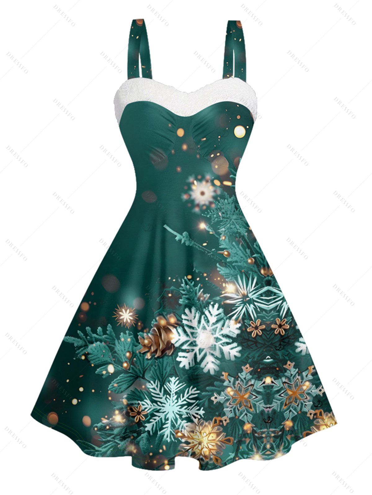 Robe courte imprimée flocons de neige de Noël, empiècement en fausse fourrure, buste froncé, col en cœur - Vert XXXXXL | US 20
