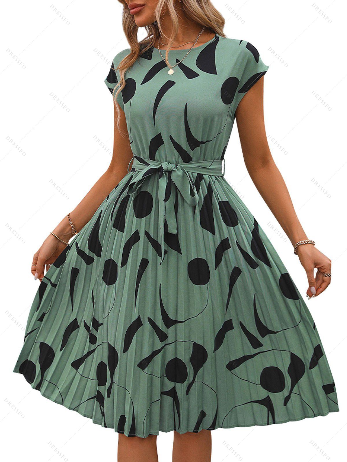 Robe D'Été à Col Rond avec Ceinture et à Mancherons à Imprimé Abstrait - Vert XL | US 12