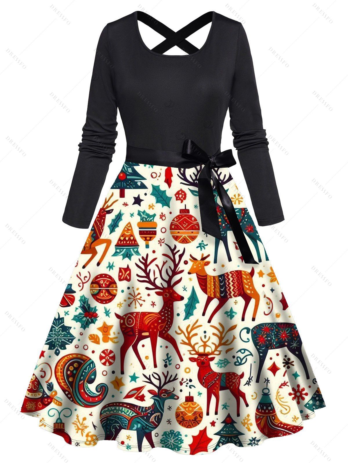 Robe de fête à imprimé sapin de Noël et clochettes en zigzag, ceinture croisée