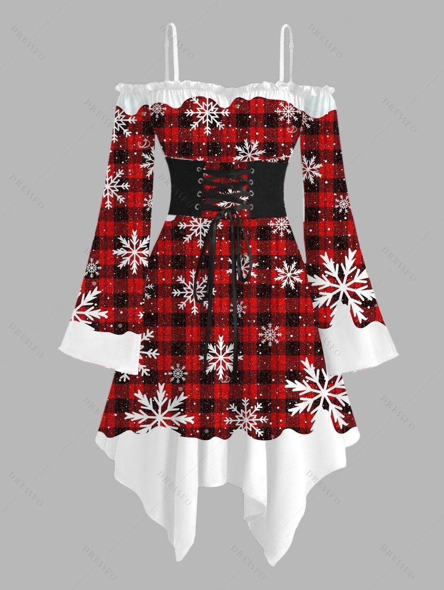 Robe de Noël à carreaux, imprimé flocon de neige, volants, lacets, ceinture, mouchoir - Rouge XXL | US 14