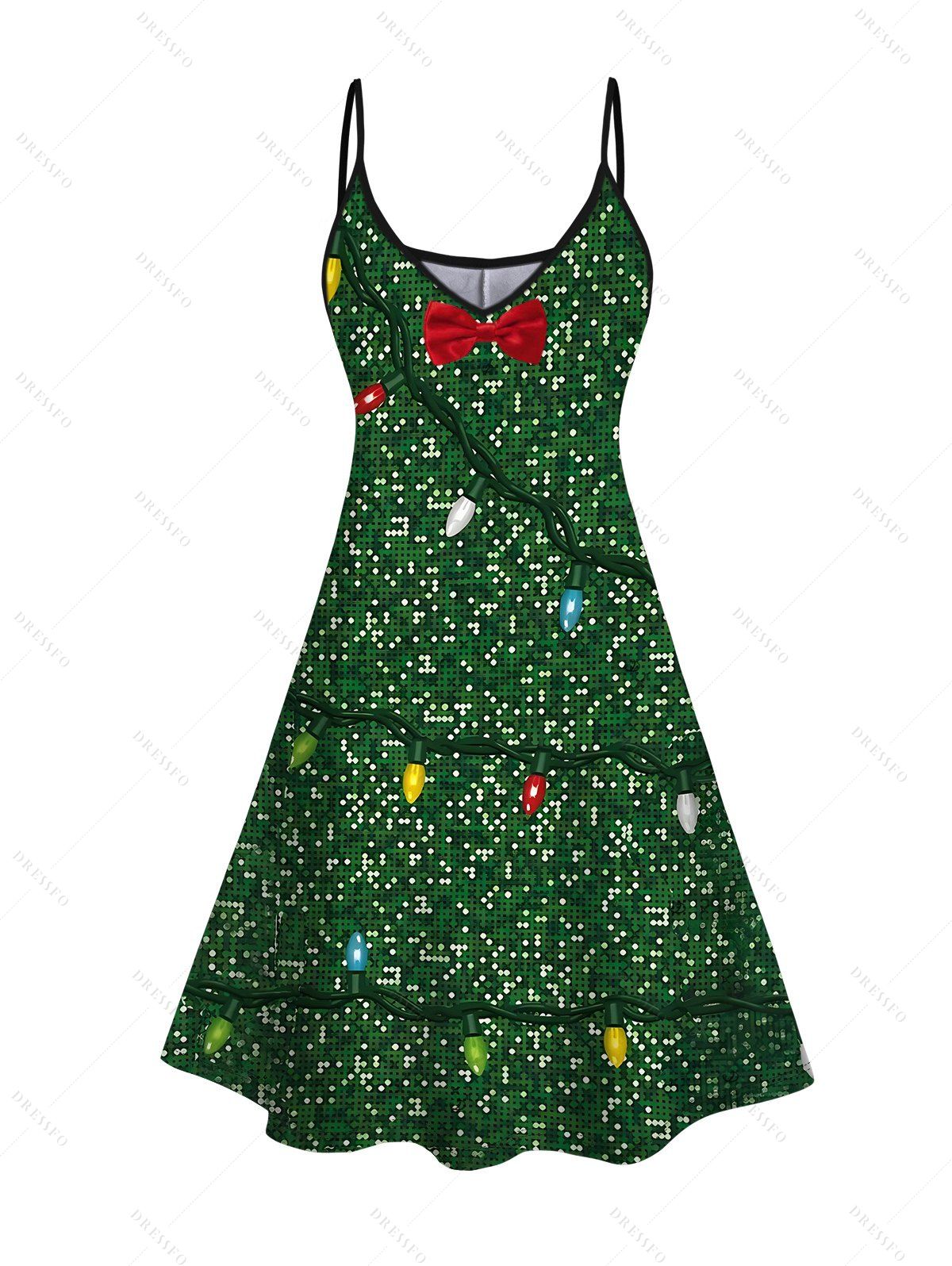 Robe de Noël imprimée à bretelles spaghetti et nœud papillon, ornée de chaînes éclair - Vert profond XXXXXL | US 20