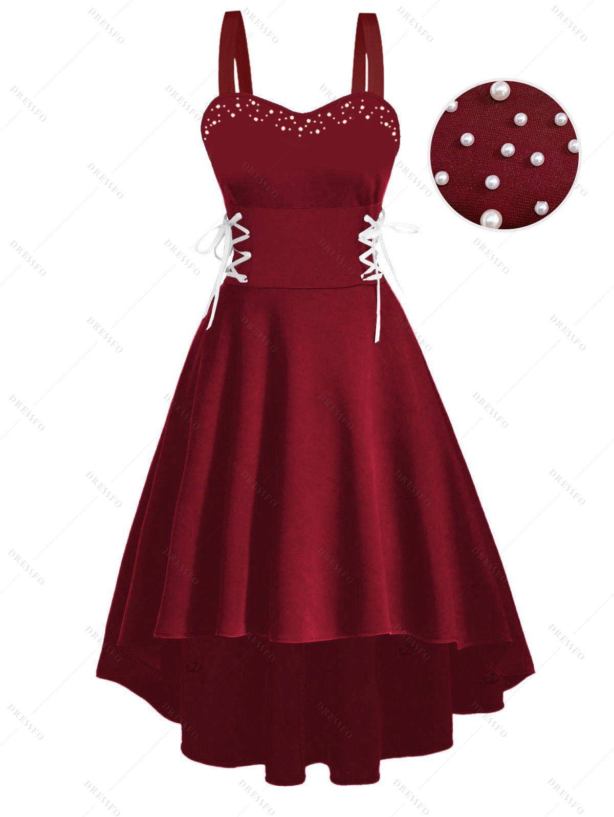 Robe de soirée sans manches à lacets et fausses perles, robe asymétrique - Rouge Vineux XXL | US 14