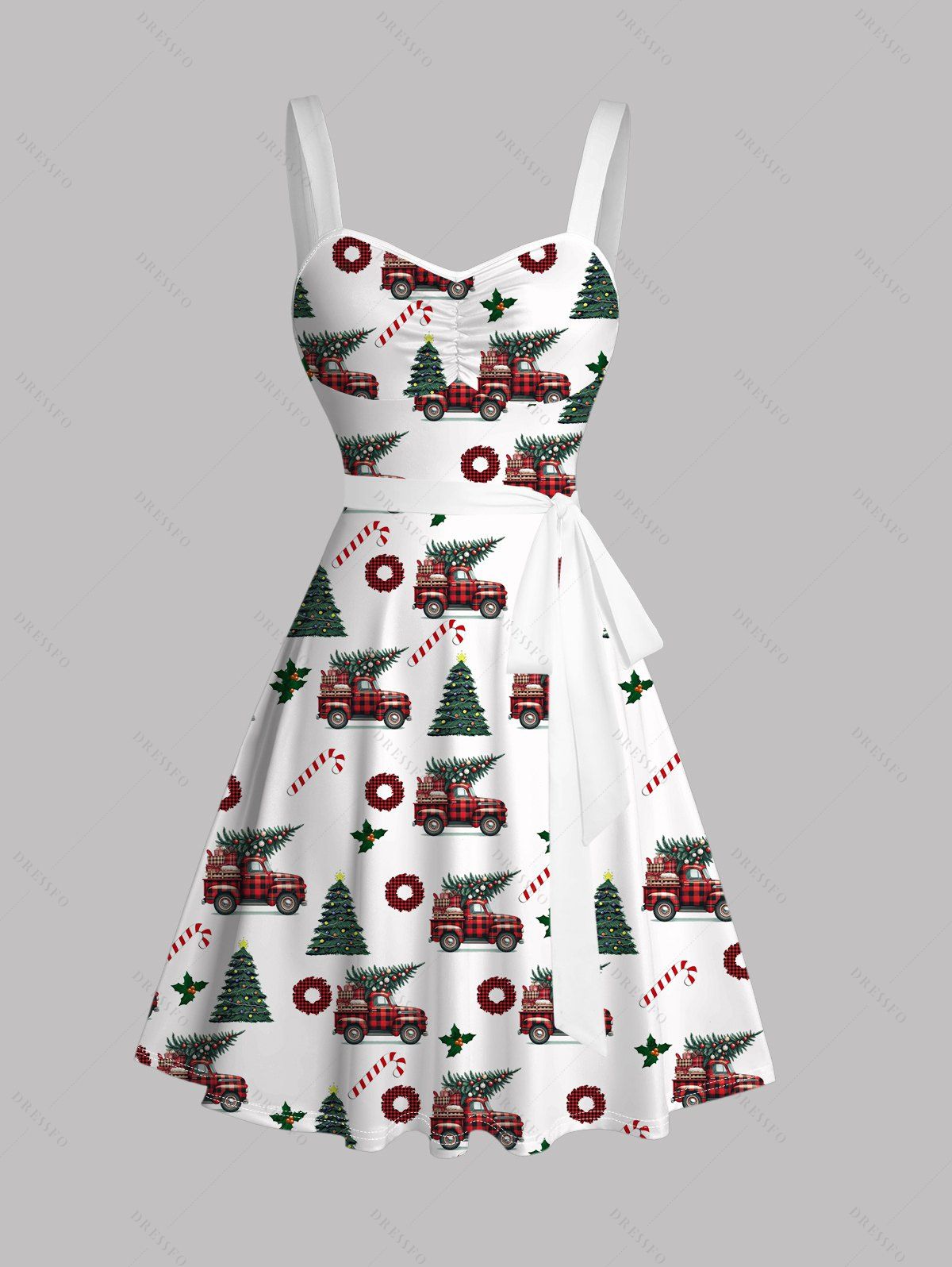 Robe de vacances à carreaux avec sapin de Noël et couronne de voiture, imprimé, robe à ceinture froncée - Blanc S | US 4