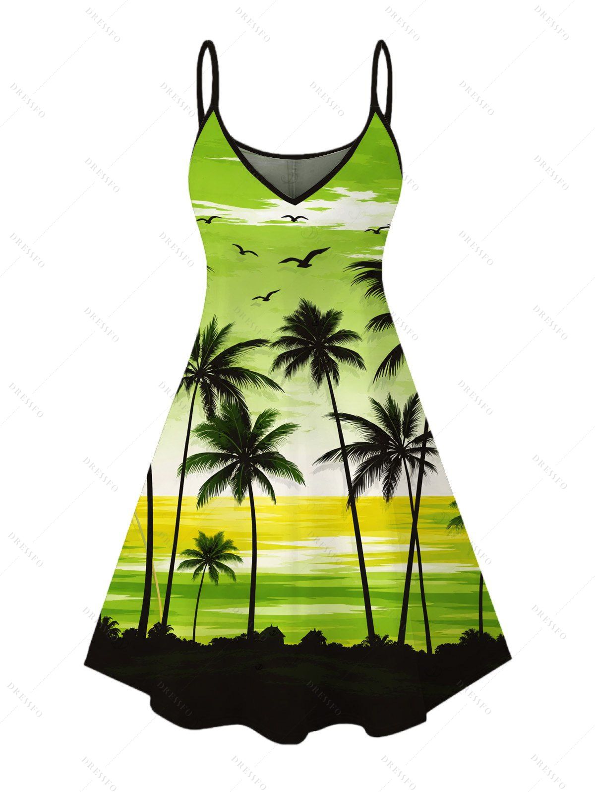 Robe de vacances à imprimé coucher de soleil tropical avec cocotiers et bretelles spaghetti - Vert XXXXXL | US 20
