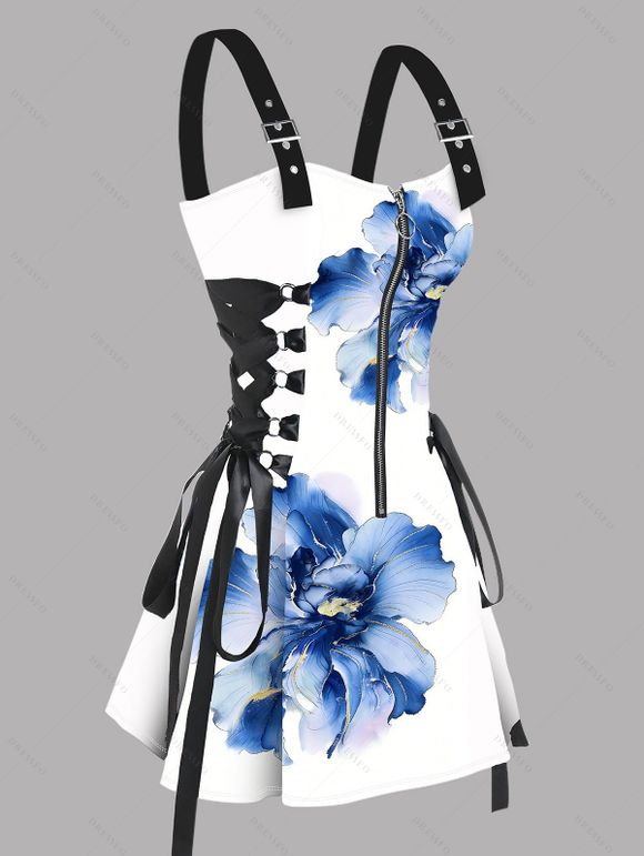 Robe de vacances imprimée d'hibiscus aquarelle, bretelles à lacets et boucle - Blanc XXL | US 14