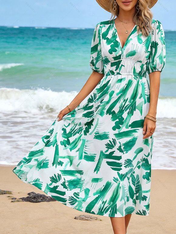 Robe de vacances imprimée à décolleté plongeant et manches bouffantes, robe midi - Vert XXL | US 12
