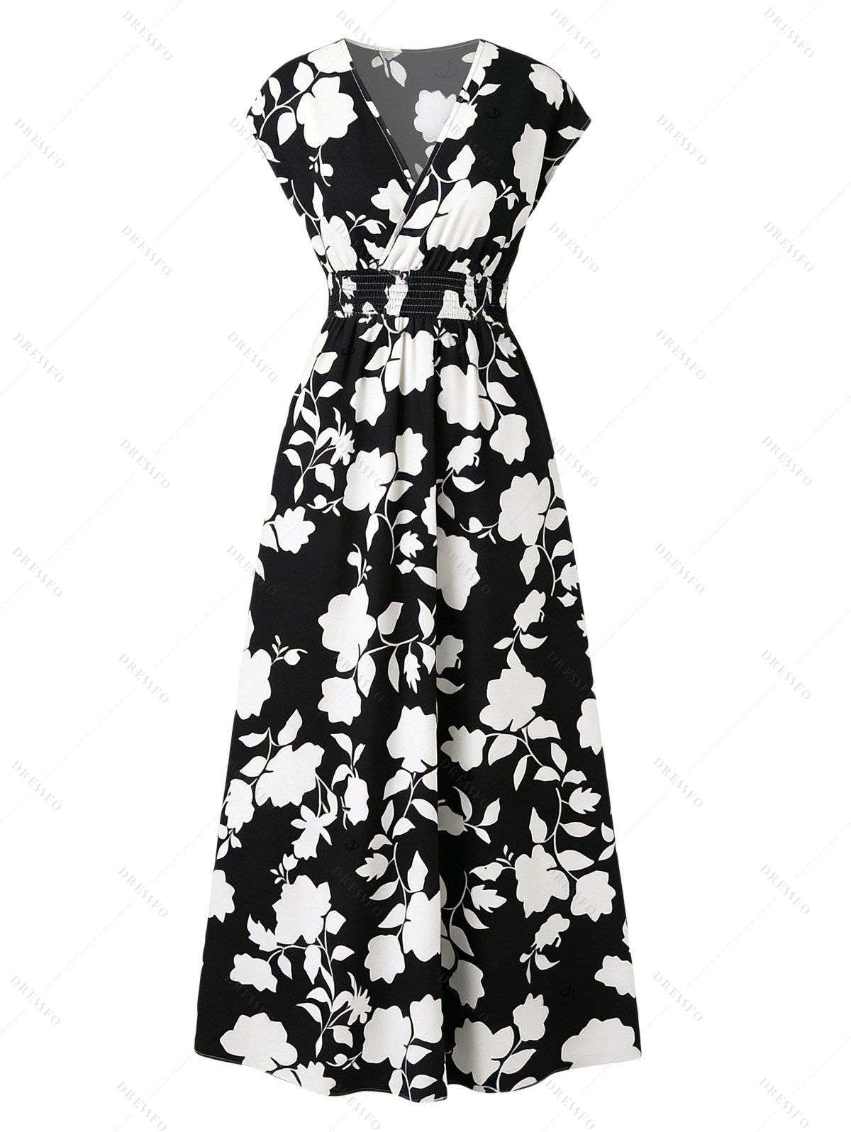 Robe de vacances imprimée de feuilles et de silhouettes, manches courtes, col en V, robe longue cache-cœur - Noir XL | US 12