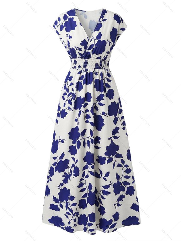 Robe de vacances imprimée de feuilles et de silhouettes, manches courtes, col en V, robe longue cache-cœur - Bleu Marine XXL | US 14