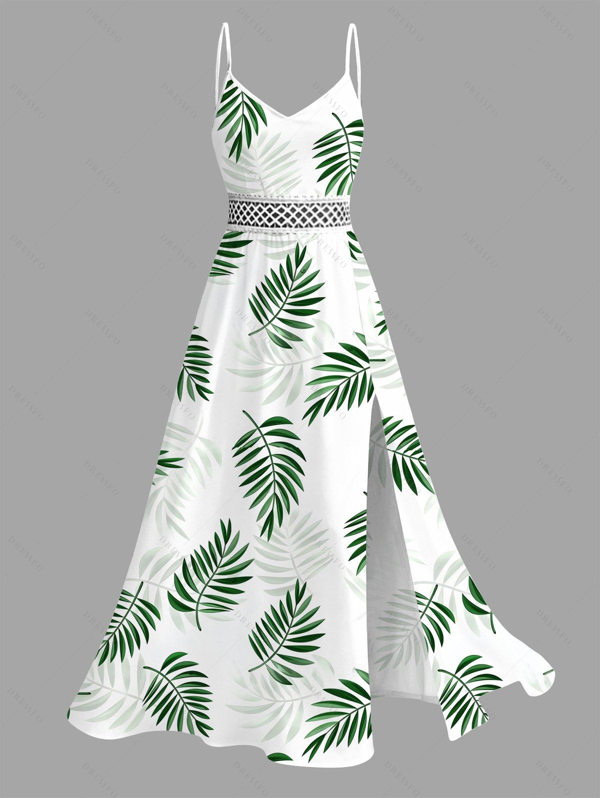 Robe de vacances imprimée de feuilles tropicales, en dentelle ajourée et fendue