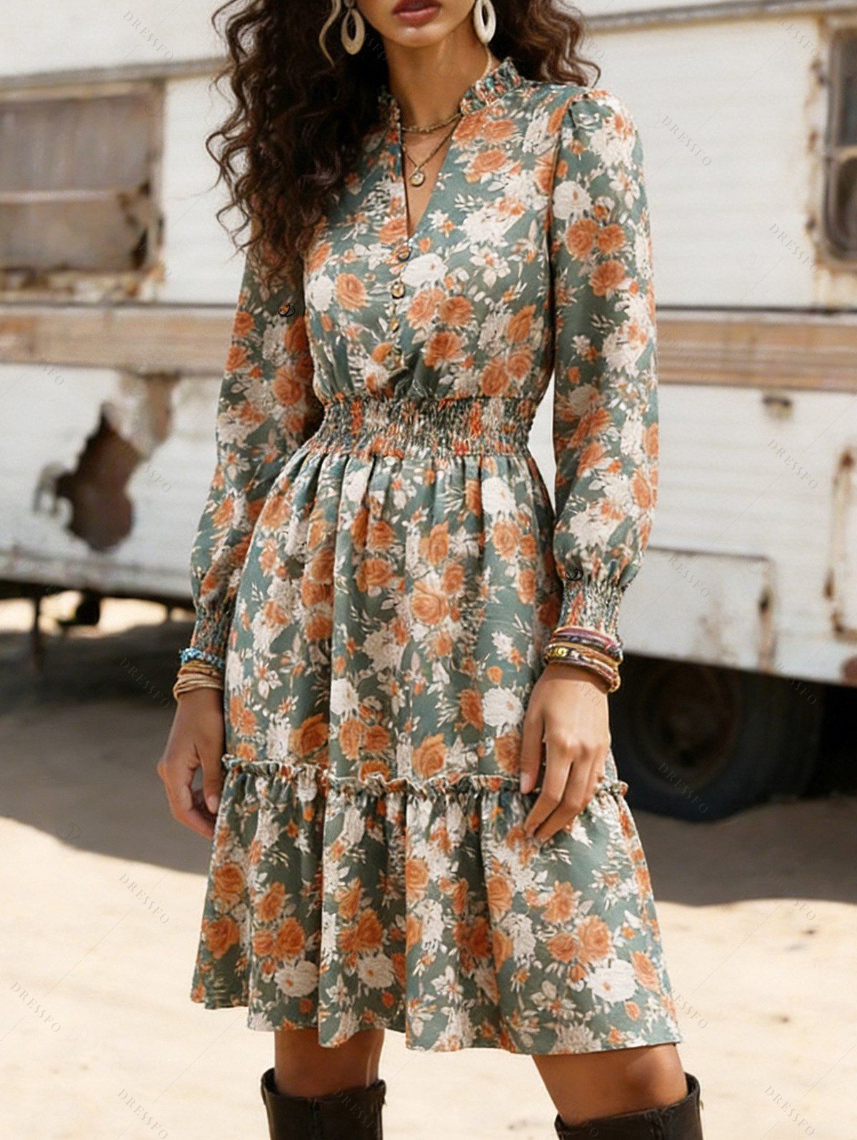 Robe de vacances imprimée de fleurs, à volants et col en V