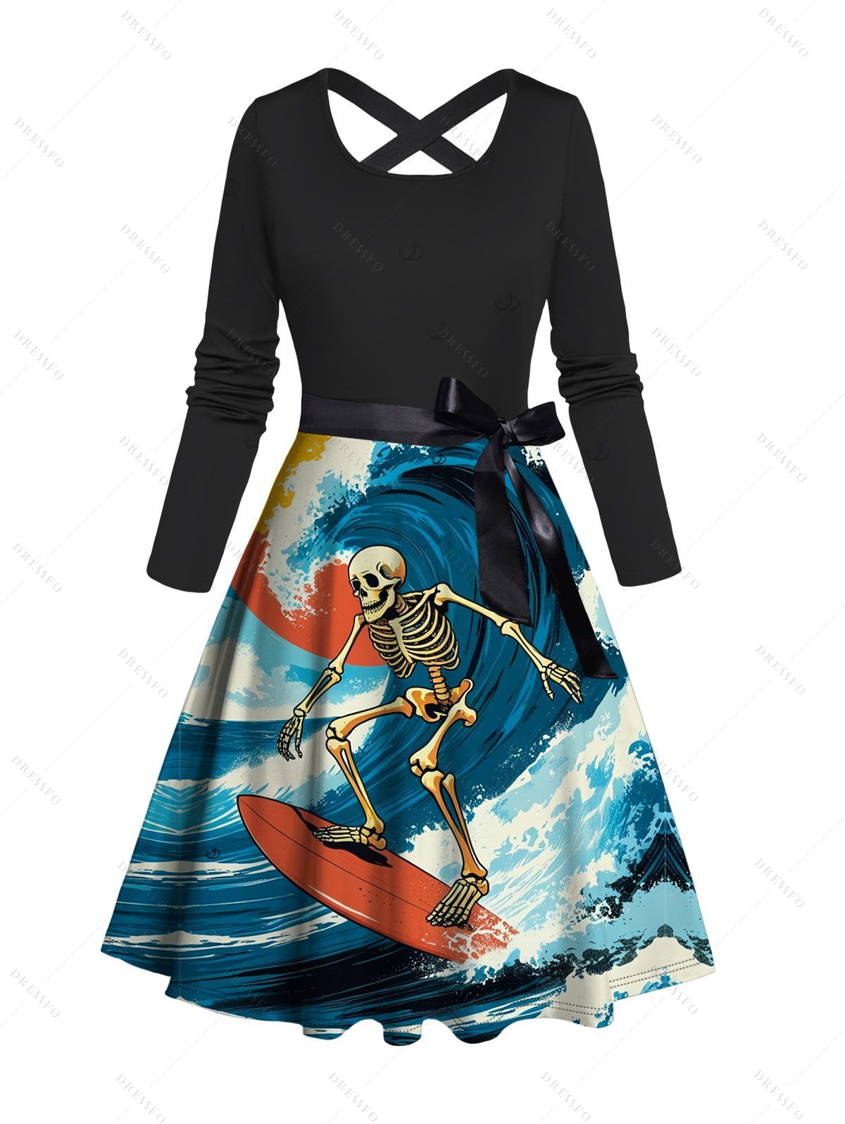 Robe de vacances imprimée vagues et squelette, ceinture croisée