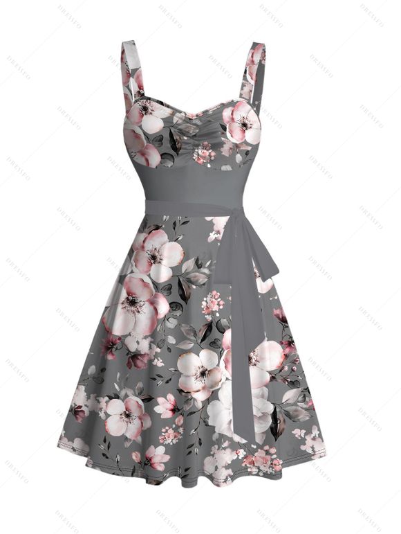 Robe de vacances à imprimé floral de prunier et ceinture froncée à la poitrine - Gris M | US 6