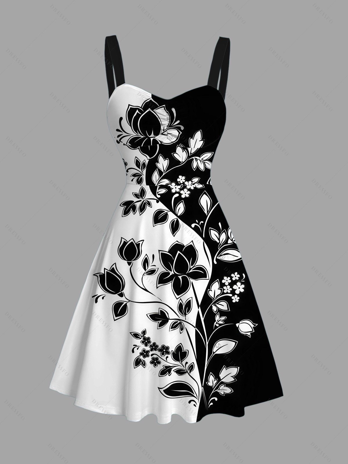 Robe de vacances à imprimé floral et feuilles, couleur contrastée, buste froncé - Noir XXXXXL | US 20