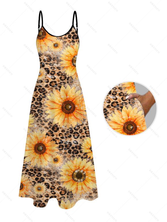 Robe de vacances à imprimé léopard tournesol, bretelles spaghetti et poches - Deep Yellow XXXXXL | US 20