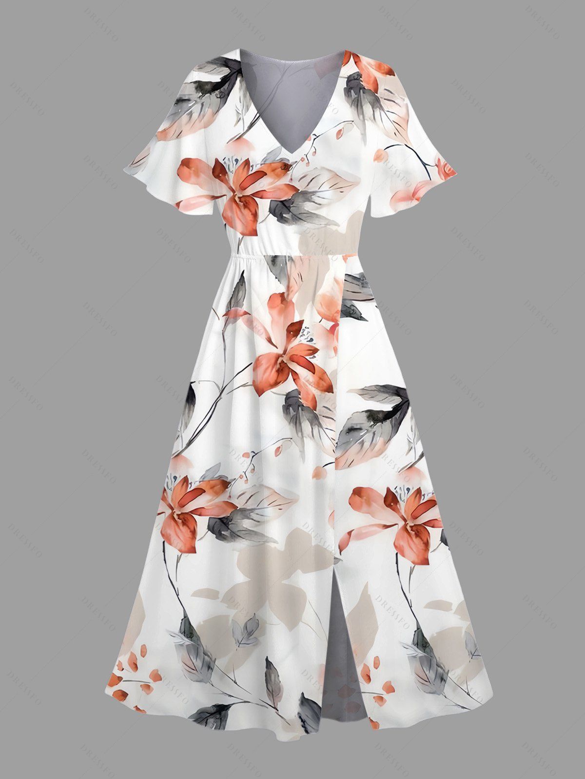Robe de vacances mi-longue fendue à imprimé aquarelle de fleurs et de feuilles