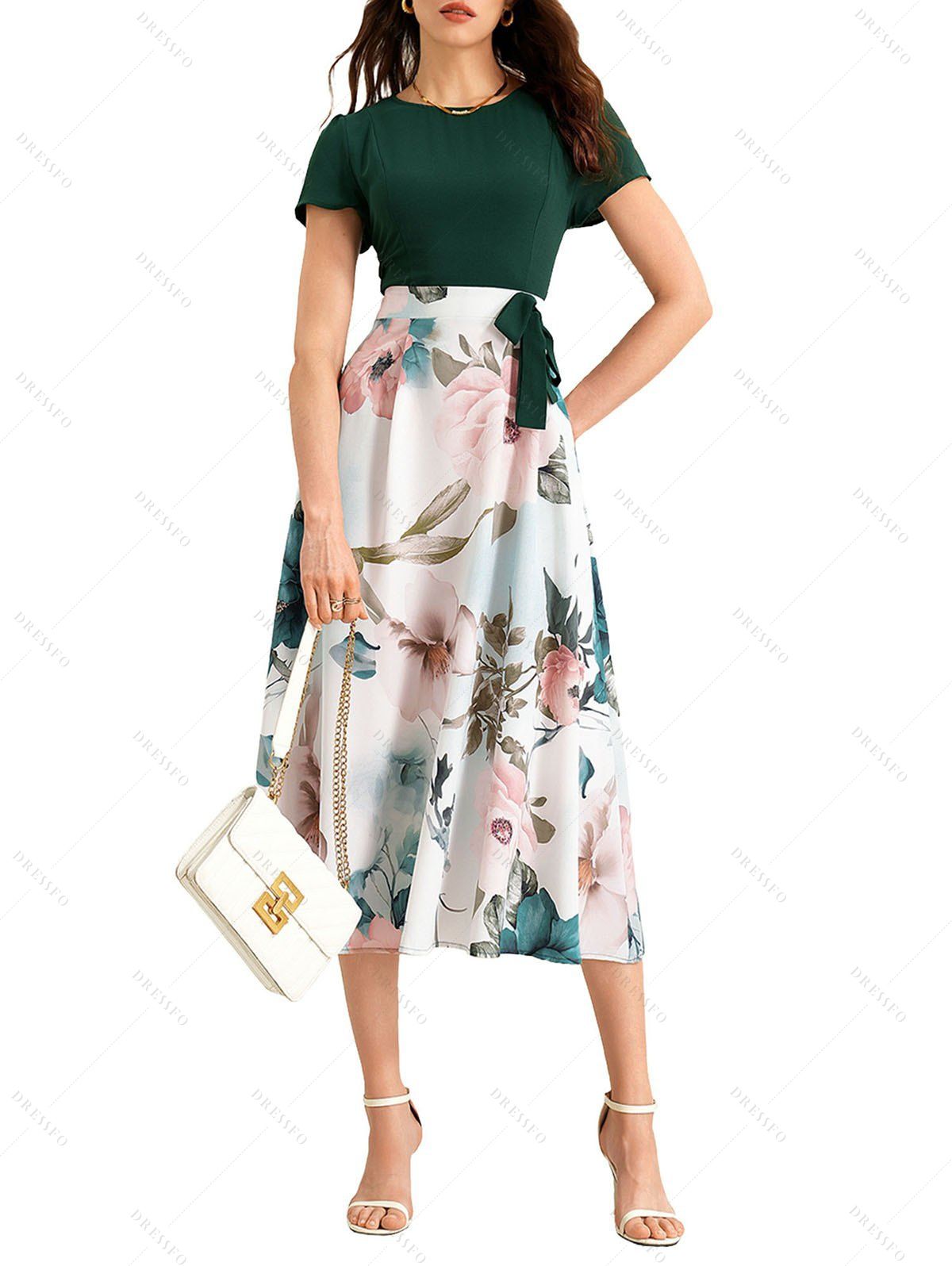Robe de vacances midi à imprimé floral aquarelle colorblock et nœud papillon - Vert profond XL | US 10