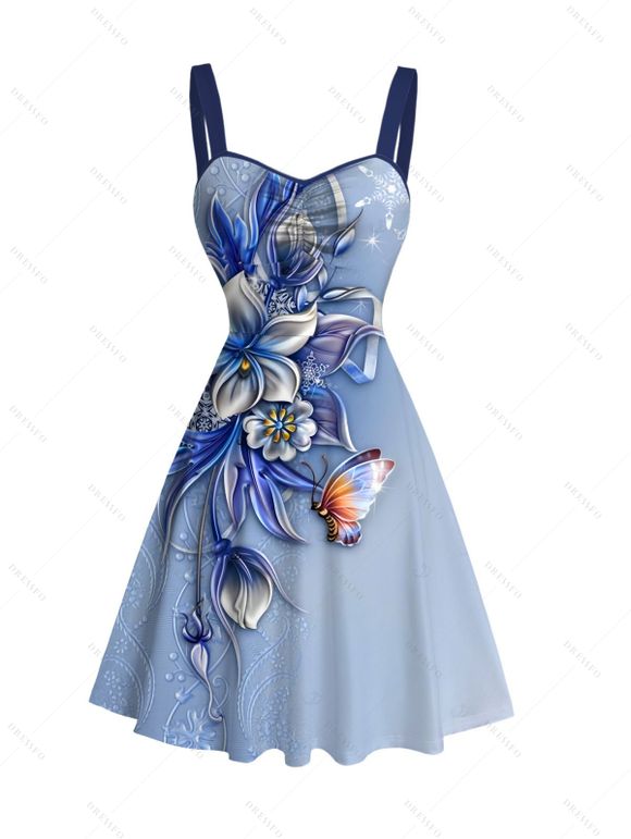 Robe de vacances mini froncée à imprimé floral et papillon - Bleu gris L | US 8-10