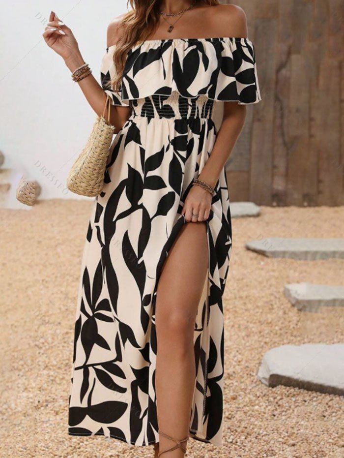 Robe de vacances à motif de feuilles, épaules dénudées et fente
