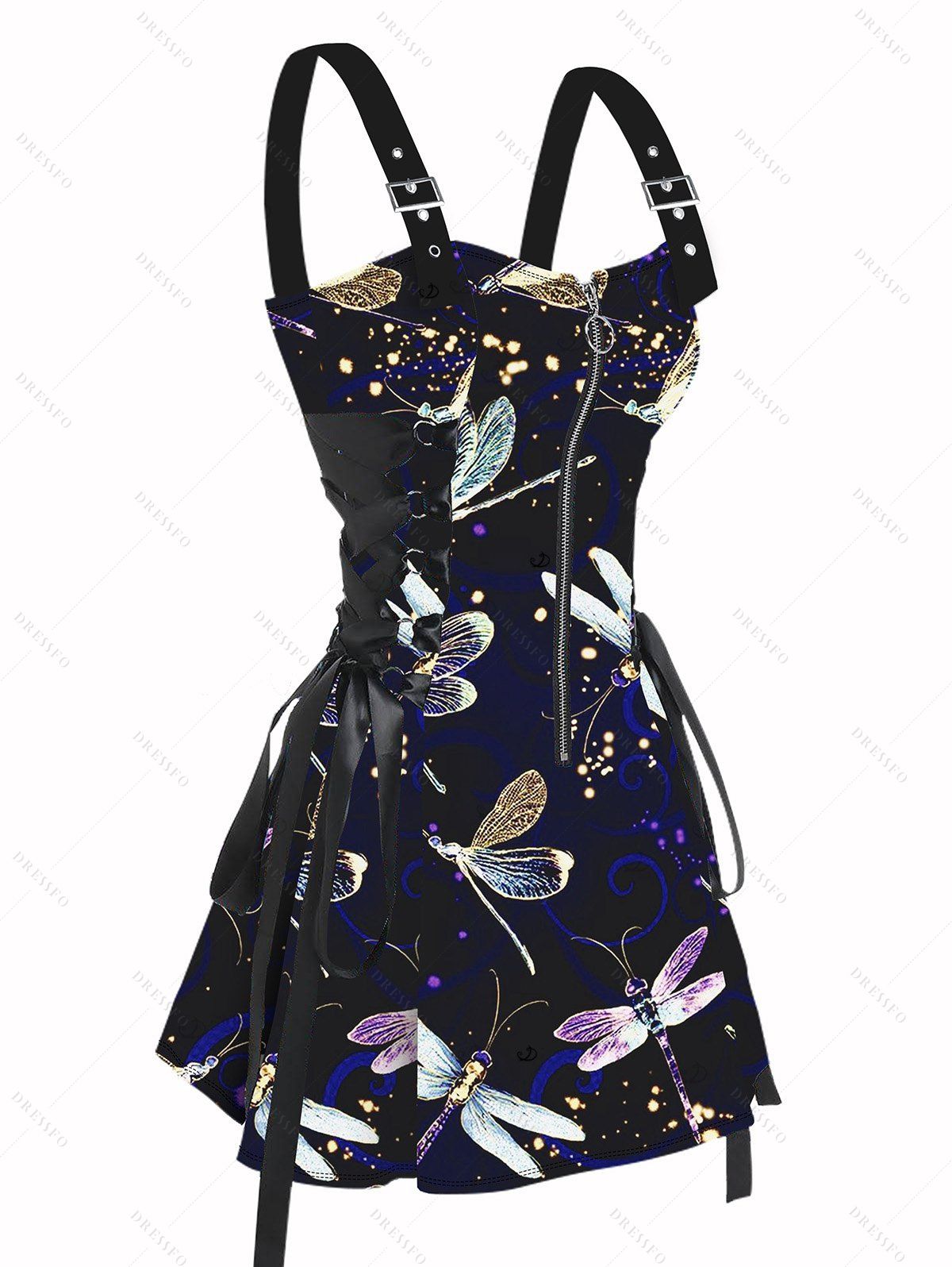 Robe de vacances à motif libellule Mystique Nuit, bretelles lacées et bouclées