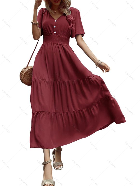 Robe de vacances unie à faux boutons et col en V, robe fatiguée - Rouge Vineux S | US 4