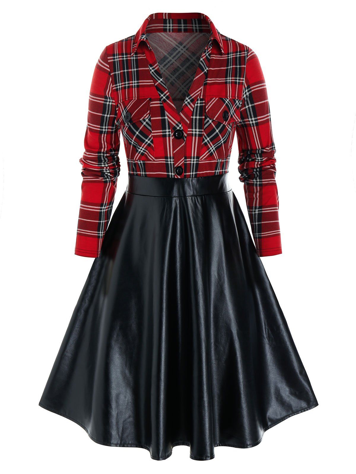 Robe en Faux Cuir à Carreaux avec Double Poches Grande-Taille - Rouge Cerise 4X