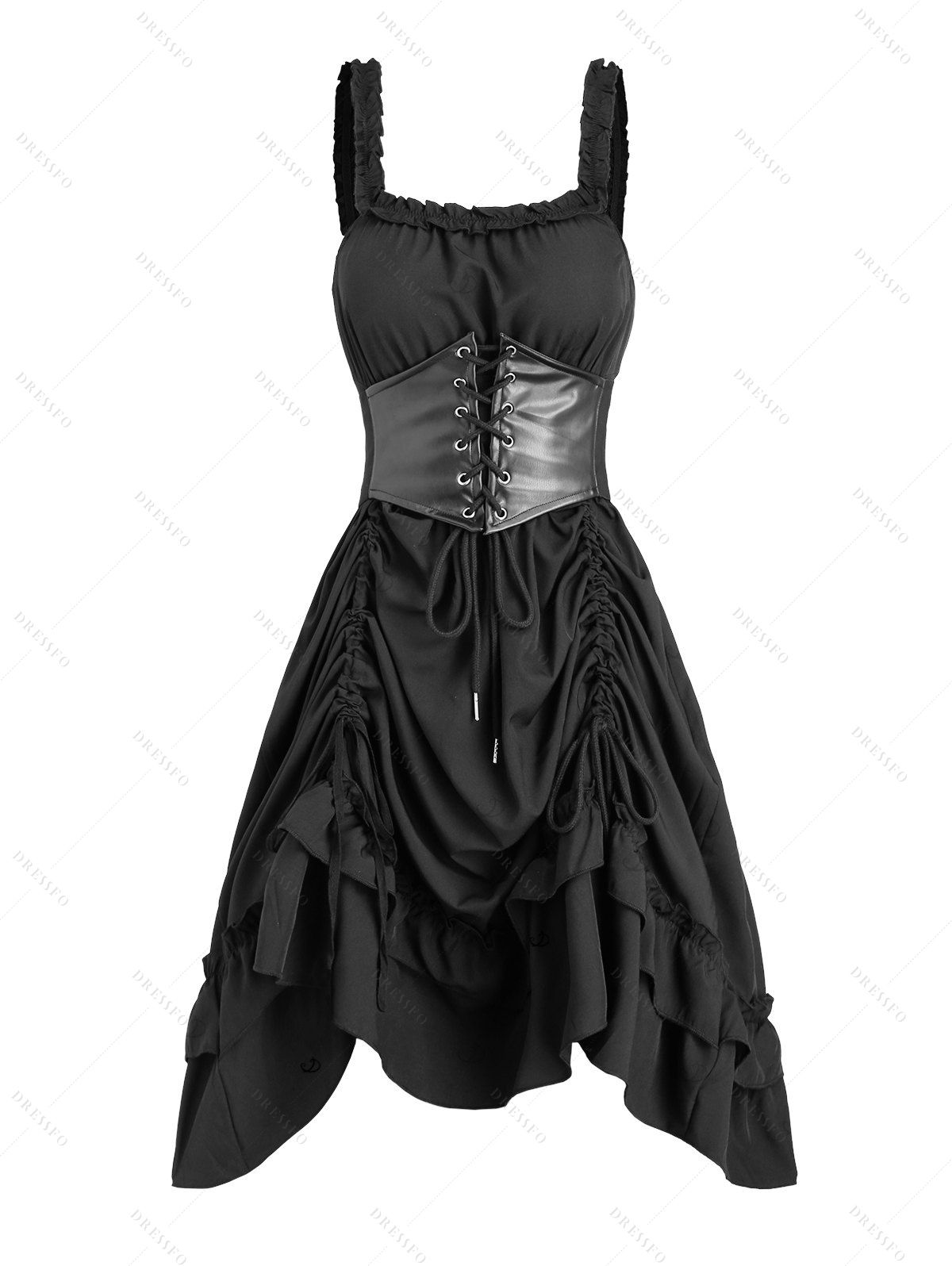 Robe gothique à empiècements en PU, lacets et volants, couleur unie