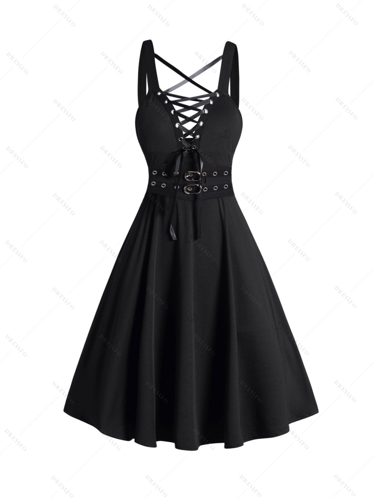 Robe gothique unie à œillets, lacets et bretelles à boucle, mini-robe - Noir XXL | US 12