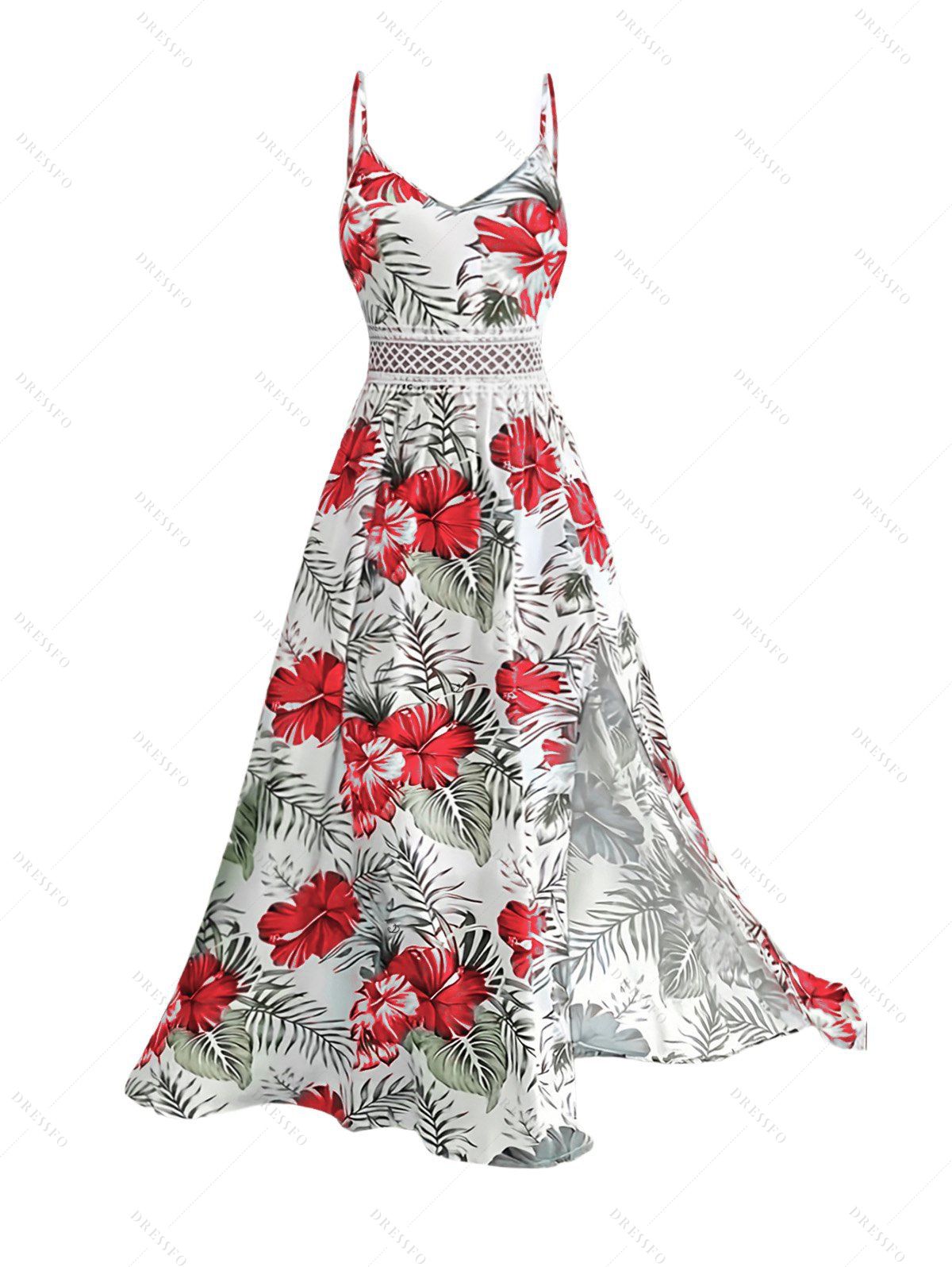 Robe longue de vacances à motif floral et feuilles, panneau en dentelle géométrique, ajourée, bretelles spaghetti, ligne A - Rouge S | US 4
