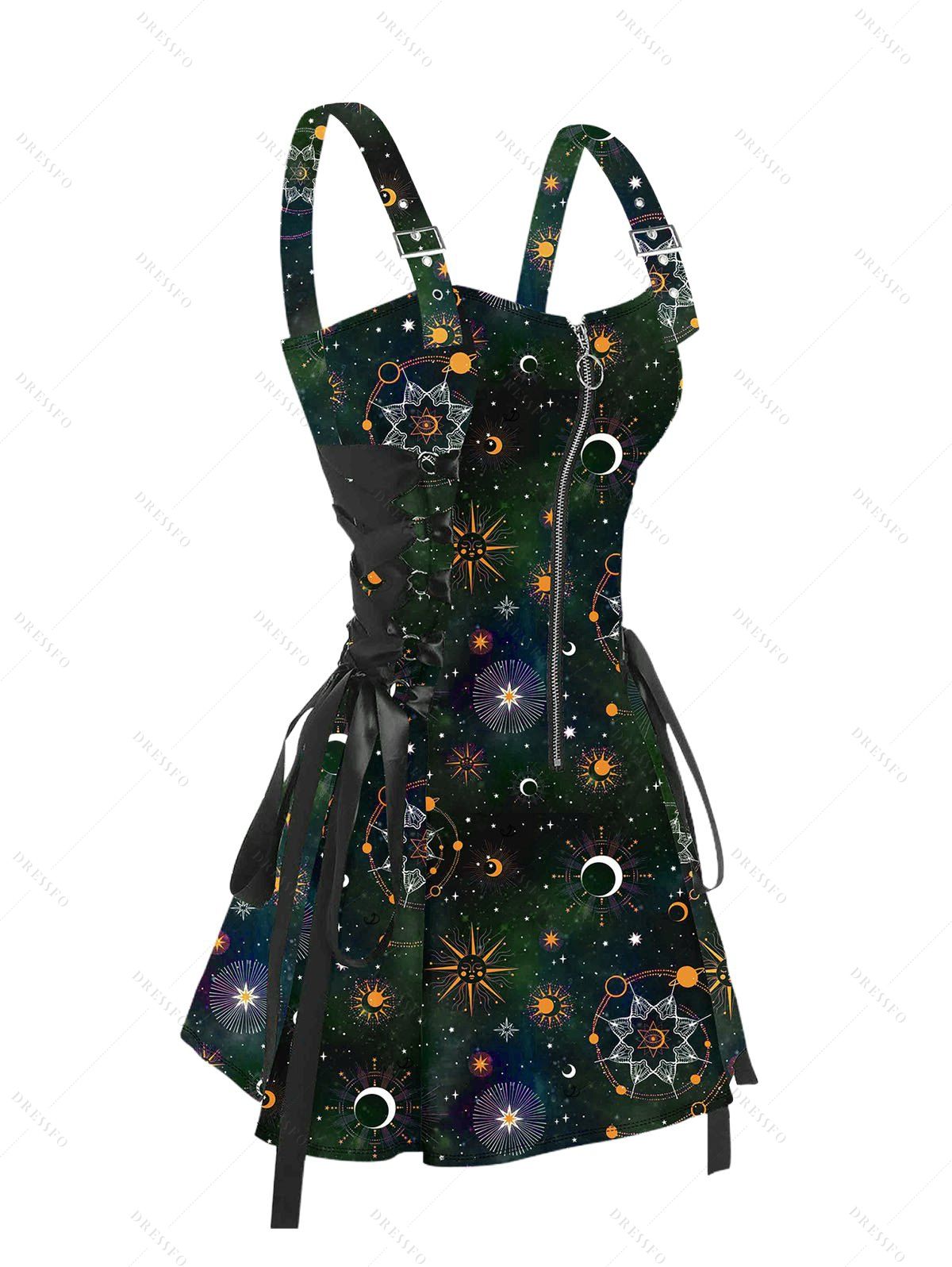 Robe mini trapèze imprimée galaxie soleil et étoiles, demi-zip, laçage, taille haute, bretelles. - Vert Armée XXL