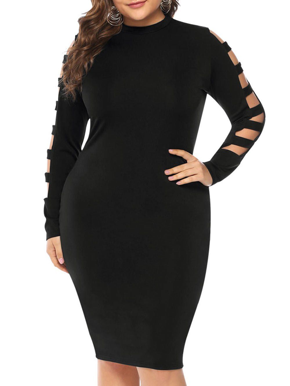 Robe Moulante à Manches en Echelle Grande Taille - Noir 2X