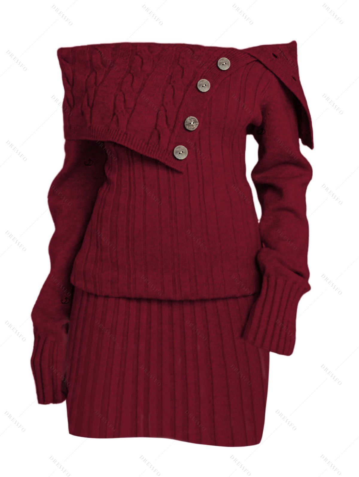 Robe pull en maille torsadée de couleur unie, robe à épaules dénudées et boutons factices - Rouge Vineux XXL | US 14